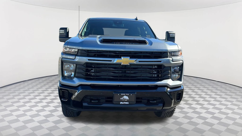 ENGINE, DURAMAX 6.6L TURBO-DIESEL V8 B20-Diesel compatible, (470 hp [350.5 kW] @ 2800 rpm, 975 lb-ft of torque [1322 Nm] @ 1600 rpm), CUSTOM CONVENIENCE PACKAGE includes (BTV) Remote Start with (UTJ) content theft alarm, (KI4) 120-volt power outlet, (KC9) 120-volt bed-mounted power outlet, (UBI) 2 charge-only USB ports for second row, (C49) rear-window defogger, (A2X) 10-way power driver seat including power lumbar, (UF2) bed LED cargo area lighting, (QT5) EZ Lift power lock and release tailgate (Included with (PDX) Custom Value Package. Beginning with the start of production certain vehicles will be forced to include (RFO) Not Equipped with USB ports rear.), LPO, ASSIST STEPS - 4" BLACK - ROUND (dealer-installed), WT/CX SAFETY PACKAGE includes (UD5) Front and Rear Park Assist, (UKC) Lane Change Alert with Side Blind Zone Alert and (UFG) Rear Cross Traffic Alert, MIRRORS, OUTSIDE POWER-ADJUSTABLE VERTICAL TRAILERING WITH HEATED AND AUTO-DIMMING UPPER GLASS lower convex mirrors, turn signal indicators, puddle lamps, (U12) perimeter lighting, auxiliary lighting, power folding/manual extending (extends 3.31" [84.25mm]) Includes (DD8) auto-dimming rearview mirror. AUDIO SYSTEM, CHEVROLET INFOTAINMENT 3 SYSTEM 7" diagonal HD color touchscreen, AM/FM stereo, Bluetooth® audio streaming for 2 active devices, voice command pass-through to phone, Wireless Apple CarPlay® and Wireless Android Auto® compatibility (STD), TRANSMISSION, 10-SPEED AUTOMATIC. Chevrolet Custom with Sterling Gray Metallic exterior and Jet Black interior features a 8 Cylinder Engine with 470 HP at 2800 RPM*.