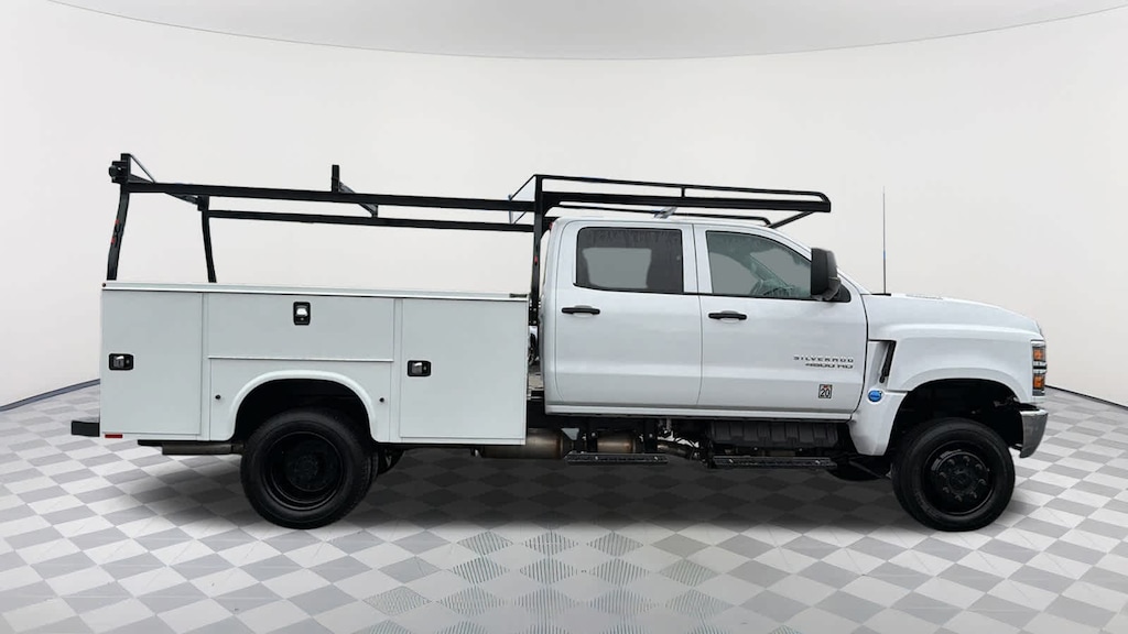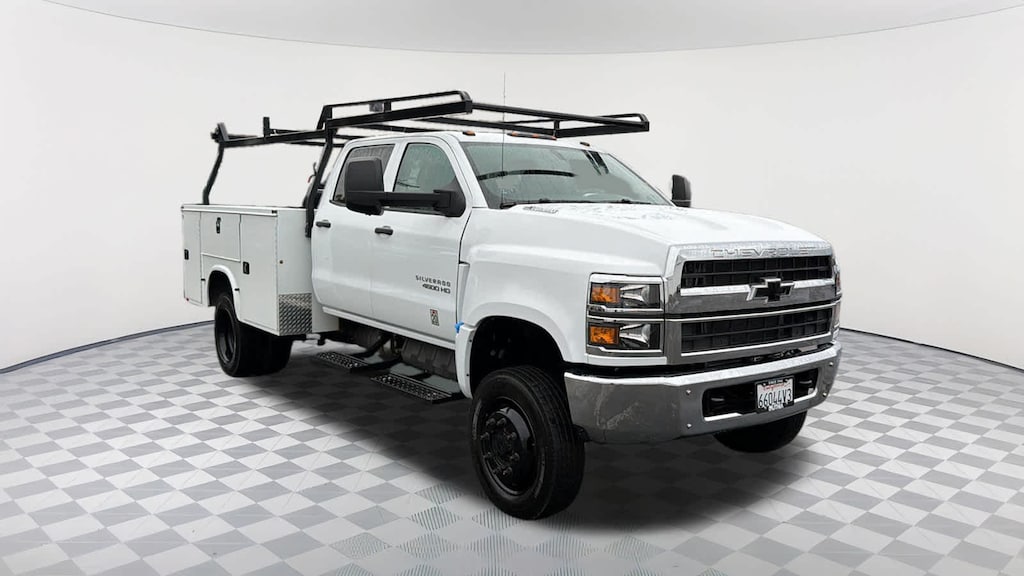 MIRRORS, OUTSIDE, BLACK, HEATED POWER-ADJUSTABLE, HIGH-VISIBILITY VERTICAL CAMPER-STYLE, AND LOWER CONVEX SPOTTER GLASS, MANUAL-FOLDING. Convex glass is not heated and not power adjustable. 102", Wide Load, RUGGED DUTY SERVICE TRANSMISSION, AUTOMATIC CLOSE-RATIO 6 SPD WITH DOUBLE OVERDRIVE, ALLISON, A1750RDS ratios 3.10 1ST, 1.80 2ND, 1.40 3RD, 1.00 4TH, 0.70 5TH, 0.61 Rugged Duty Series, AXLE, LIMITED SLIP, DANA SPICER TRUETRAC, TORQUE PROPORTIONING LIMITED SLIP, GLASS, DEEP-TINTED, REMOTE KEYLESS ENTRY, AUDIO SYSTEM, 4.2" DIAGONAL COLOR DISPLAY AM/FM stereo with USB port and auxiliary jack (STD), ENGINE, DURAMAX 6.6L TURBO-DIESEL V8, B20-DIESEL COMPATIBLE 350 hp @ 2500 rpm, 750 lb.-ft. torque @ 1400 rpm (STD). Chevrolet Work Truck with Summit White exterior and Dark Ash seats with Jet Black interior accents interior features a 8 Cylinder Engine with 350 HP at 2500 RPM*.
